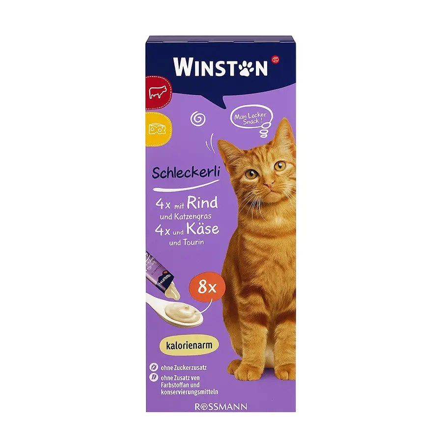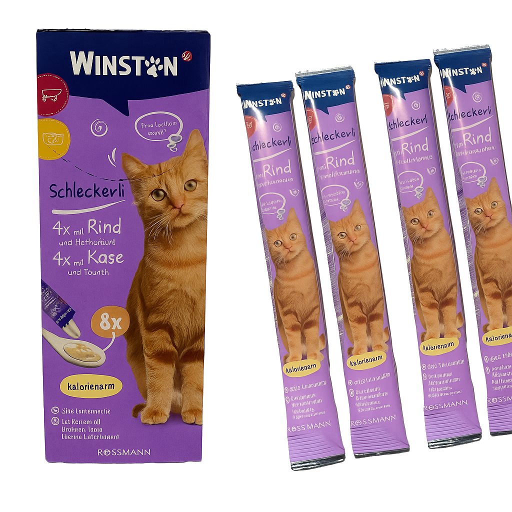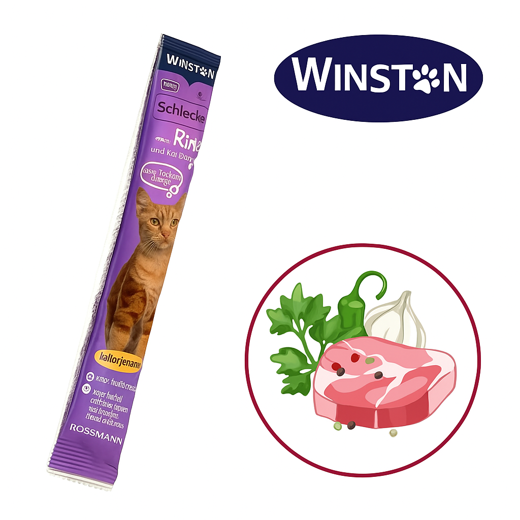 بستنی گربه وینستون (Winston Schleckerli) با طعم گوشت گاو و پنیر، یکی از خوش‌ طعم‌ ترین میان‌ وعده‌ های مخصوص گربه‌ هاست که توسط برند معتبر آلمانی Rossmann تولید شده است. این محصول با فرمولی کم‌ کالری و بدون افزودنی‌ های مصنوعی، ترکیبی از گوشت گاو و پنیر مغذی ارائه می‌ دهد تا سلامت قلب، بینایی و سیستم گوارشی گربه حفظ شود. بافت کرمی و نرم این تشویقی باعث می‌ شود گربه‌ ها به‌راحتی آن را لیس بزنند و از طعم لذیذش لذت ببرند.